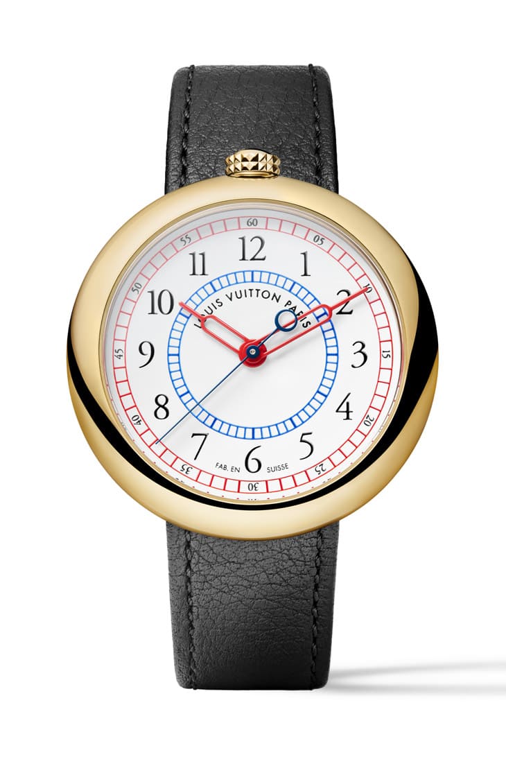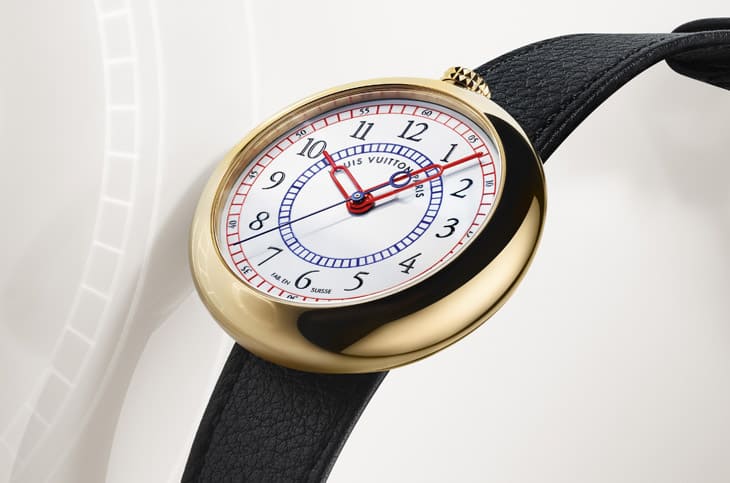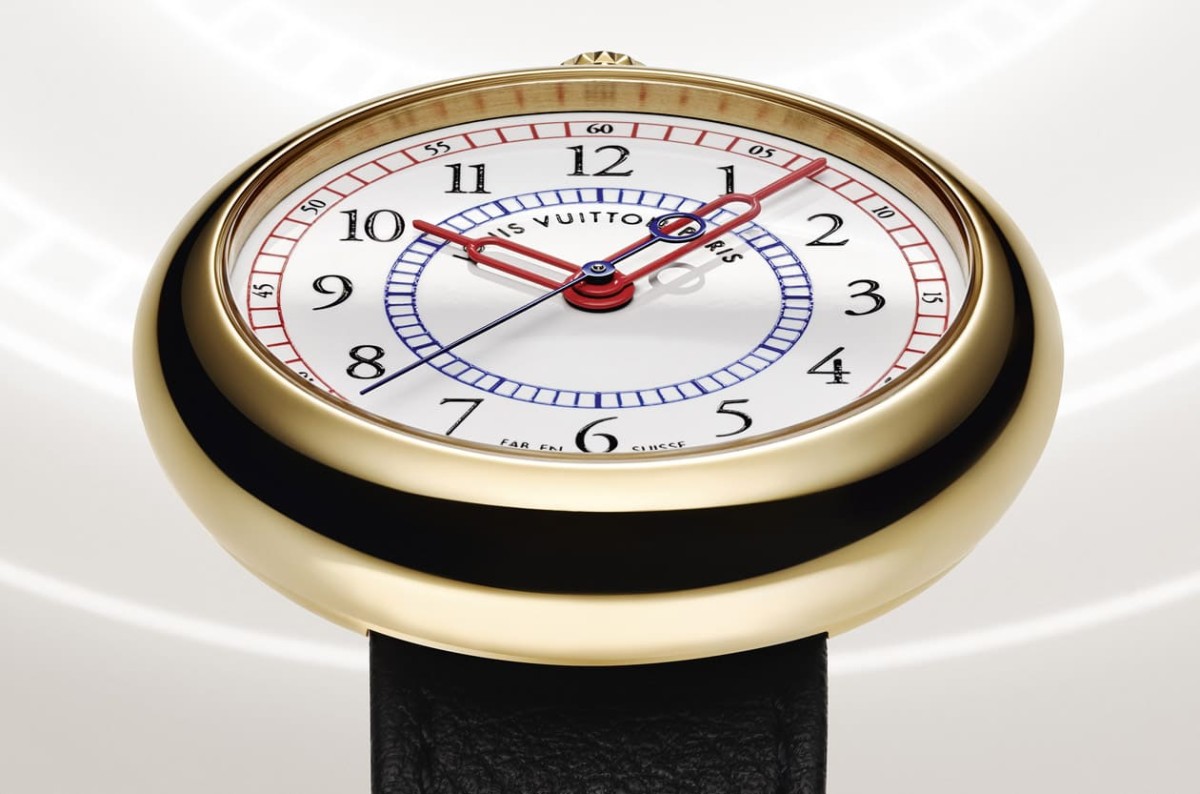 这款新作的设计灵感来自怀表轮廓与旅行精神,鹅卵石般的圆润表壳、12点钟位置的表冠设计,让它在1980年代末期显得前卫无比,路易威登这次忠实保留了这种不对称的优雅比例,表壳由品牌自有工坊La Fabrique des Boîtiers手工打造,拋光光洁如镜,39mm的尺寸使其在当代手腕上显得恰到好处,黄金材质则延续了品牌早期高级手表的温润气质。