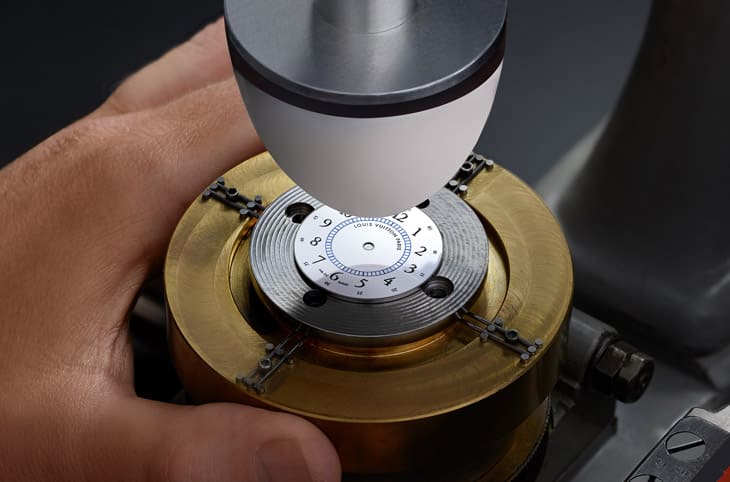 进入面盘部分,Monterey以更纯粹的方式表达时间,原版LV I拥有月相、世界时间、闹钟等多项复杂功能,而新作选择回归简约,让焦点回到工艺本身。面盘採用白色大明火珐琅制作,这是制表界中颇具挑战性的技术,每一层珐琅粉都需在800~900°C的高温中多次烧制,仅一个小瑕疵就可能让作品报废。LOUIS VUITTON工坊在此基础上,为红、蓝、黑三色刻度或数字进行多次独立烧制与压印,让整体层次与饱和度达到令人惊嘆的细腻程度。