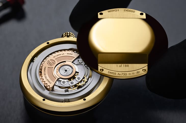 真正的革新藏在表壳之内,当年的LV I、LV II乃是使用IWC石英机芯,而如今路易威登以自家工坊La Fabrique du Temps所研发的LFT MA01.02自动机芯取代,象徵品牌在制表自主化上的重大进展。这枚机芯具备45小时动力储存,震频达4Hz,虽然藏于实底盖之下,但内部修饰依旧讲究:主夹板採圆纹打磨,桥板以喷砂与倒角处理,细节一丝不苟,机芯自动盘以玫瑰金制成,中央开出V形切口,既是品牌缩写象徵,也平衡了视觉与功能性。