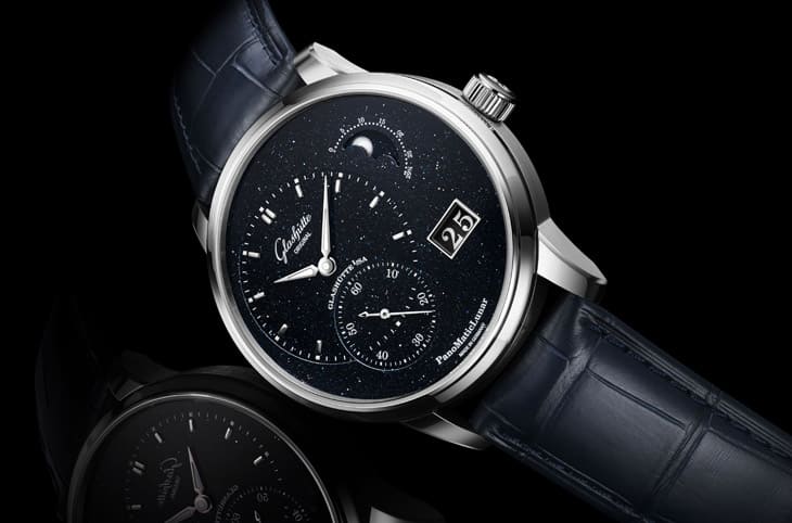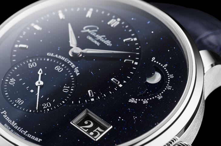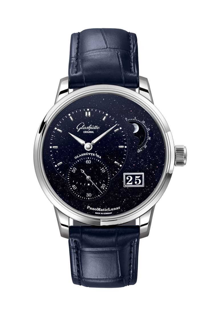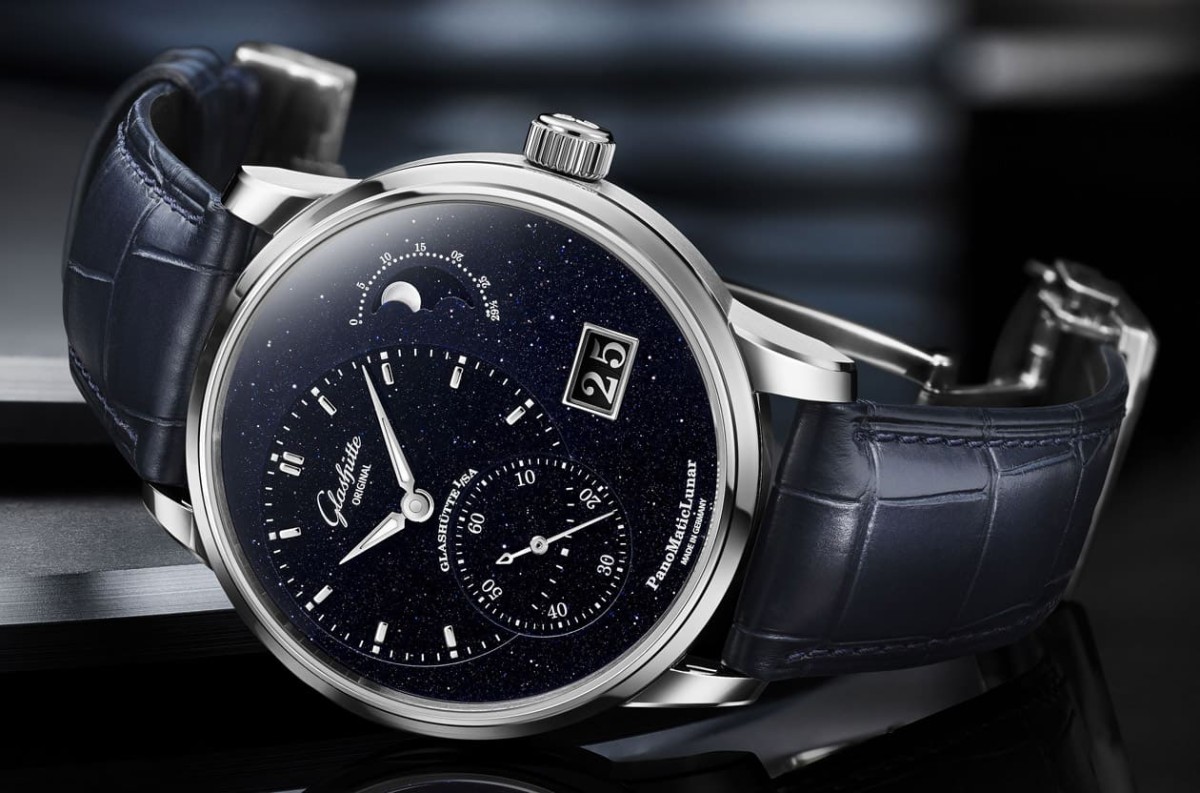 这款纪念表最吸睛的部分,无疑是深蓝色砂金石面盘,这是格拉苏蒂原创首次在偏心月相系列中採用此材质,砂金石最早诞生于17世纪的威尼斯穆拉诺岛,细小金属微粒在蓝色玻璃中闪烁,彷彿夜空星光静静流动,格拉苏蒂原创以这种古老工艺,为面盘赋予层次与光影的变化,让人一眼望去,便能感受到浪漫与深邃。