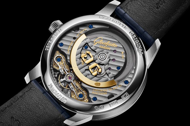 透明底盖下可欣赏机芯的德系工艺细节,例如电镀灰色的四分之三夹板上刻有格拉苏蒂柱状纹饰,深浅对比突显蓝钢螺丝与手工修饰的精致层次,鹅颈式微调装置则延续自1888年的传统,这一结构至今仍是品牌一大招牌元素,既实用又优雅。整只表的组装与打磨,皆在格拉苏蒂原厂工坊内手工完成,制表师以细腻的步骤为每一枚零件调校,确保其机芯运作与视觉呈现都达到最高标准。