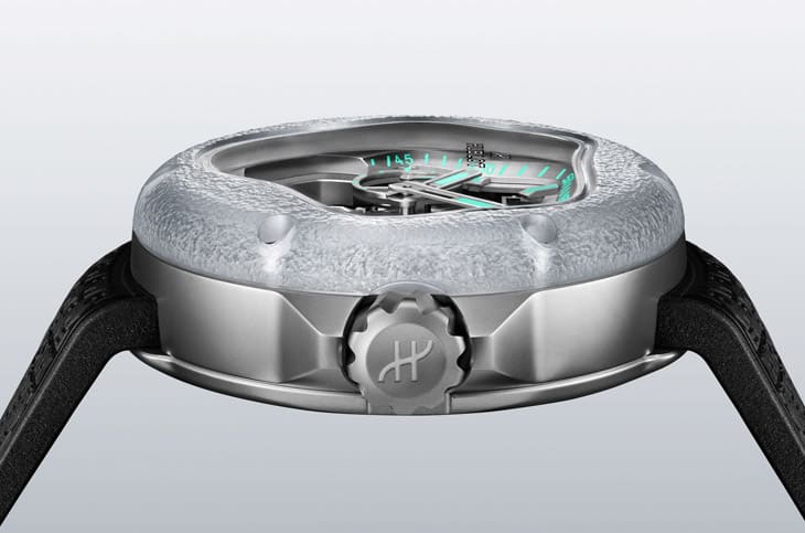 ▲手表採雾面喷砂钛金属表壳与磨砂蓝宝石表圈,结合雾面透明质感,创造流动与结构并存的外观。