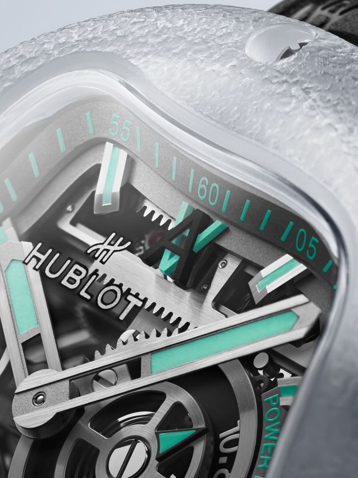 细节上,宇舶依旧保留品牌辨识度极高的元素,包括表圈上六颗H形螺丝、侧面凸起结构等,但这次经过柔化曲线处理,让整体轮廓更具流动感,经由透明的蓝宝石底盖与半透明的表圈,表内的结构与机械细节一览无遗,视觉上宛如在观察被凝固于时间中的液体。