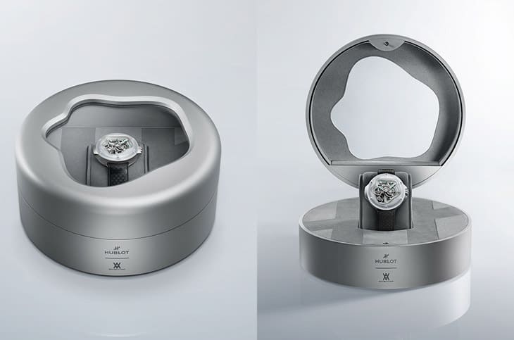 视觉之外,宇舶与Arsham还特别打造了一个极具艺术性的表盒,这个铝制圆柱体造型呼应表壳轮廓,顶部的「舷窗」可窥见手表本体,宛如保存于未来考古实验室的时间标本,这样的细节让整个作品不再仅仅是一只表,而具有完整的艺术品概念。