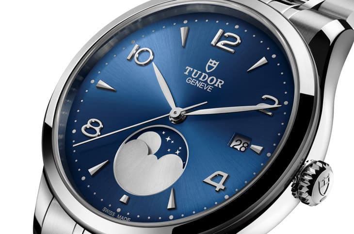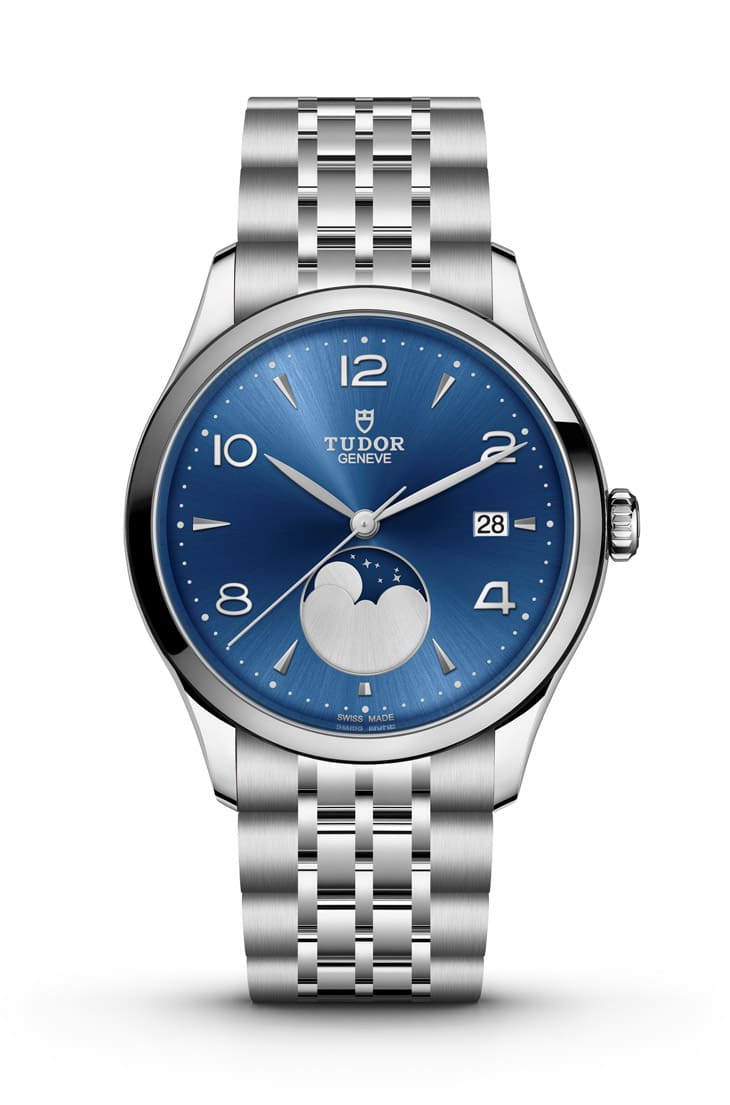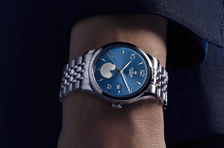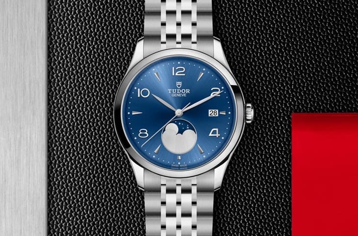 1926 Luna系列中的蓝面款以316L不锈钢打造,整体外观乾净俐落,39mm直径让它在正装表与日常佩戴之间取得平衡,线条修长、比例优雅,表壳以全拋光处理强化其正式感,光影流动时能展现出近似白金的光泽,儘管是以月相正装表为主题,但其结构并不脆弱,像是旋入式表冠与实心底盖带来100米防水性能,属同类型表款中的罕见设计,让这只表兼具实穿性与美感。手表配置七排式链带设计,外层链节以缎面拉丝呈现内敛质感,中央链节则拋光处理,两种表面质感交错出丰富层次,既有复古味又不失现代感。整体造型延续帝舵对实用与美学的平衡哲学:一只看似优雅的月相表,却拥有可应对日常使用的结构与耐用度,正是品牌"Born to Dare"精神在正装领域的具体体现。