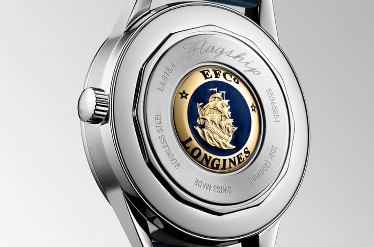 Flagship Heritage月相表採用拋光不锈钢打造,直径38.5mm,这个尺寸戴在手上刚刚好,12.4mm的厚度虽稍显厚实,但也让整只表更具份量感,浪琴表在造型上巧妙融合了现代线条与复古轮廓,从弧形表耳到低调的圆形表冠,都散发着1950年代的绅士气息。表壳的打磨是亮点之一,表耳外缘以细致倒角处理,拋光面与拉丝面交错,让光线在不同角度下产生微妙变化,这样的对比细节,不仅让表壳显得更纤细,也提升了整体精致度。最具辨识度的设计藏在表背,有一枚18K金打造、手绘珐琅的帆船徽章,象徵着Flagship之名的真正精神,船只正扬帆远航,寓意力量与稳定,这个传承自1950年代的标志设计,至今仍是收藏家辨认浪琴表经典正装表的关键符号。