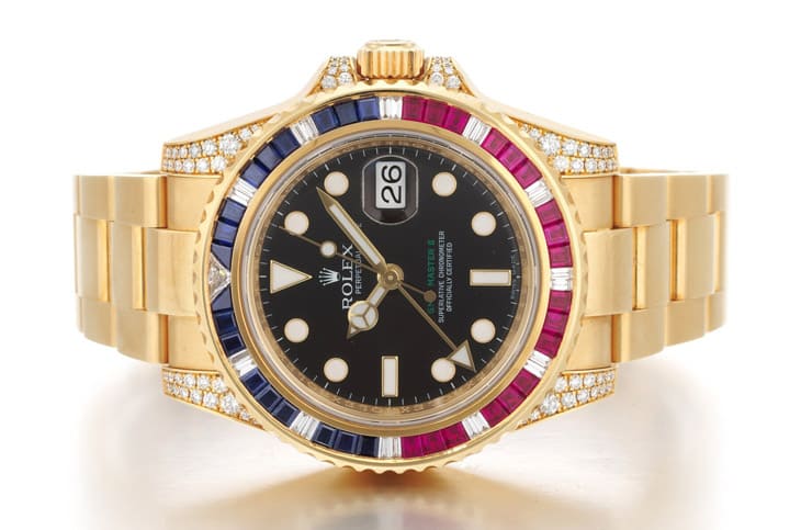 ▲116758SARU以黄金打造,镶嵌红蓝宝与钻石圈,象徵劳力士顶级制表与珠宝工艺的融合。Source:Sotheby's