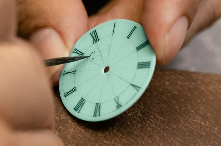▲工匠以极细笔刷手绘罗马数字与麦森标志,每一层顏料皆经窑火固定,笔触精准细致。