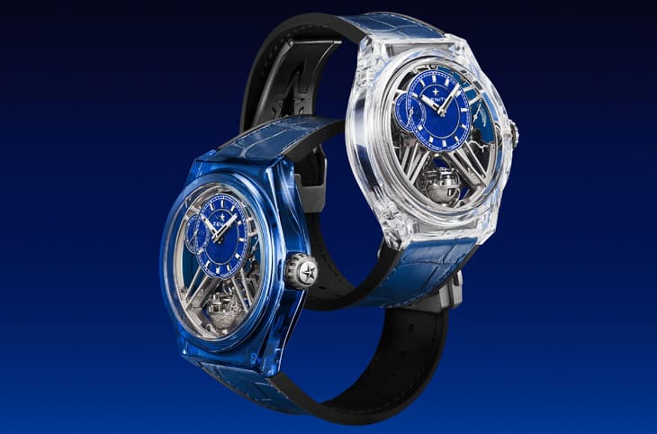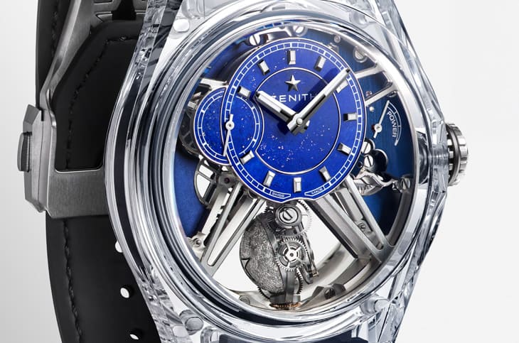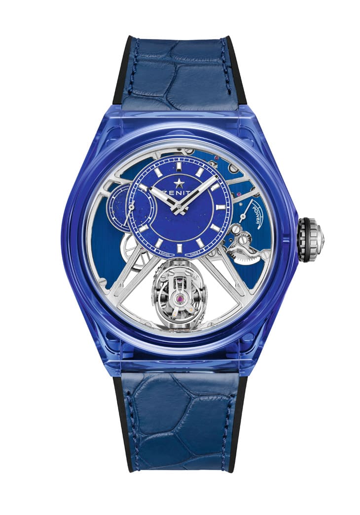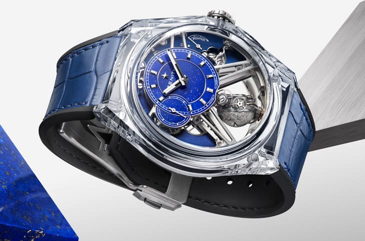 蓝宝石材质/El Primero 8812手动上链机芯/偏心时、偏心分、小秒显示/「重力控制」陀螺仪装置/动力储存显示/青金石小表盘/蓝宝石水晶镜面、透明底盖/防水30米/表径46mm/限量10只/参考价:NT$ 7,280,000