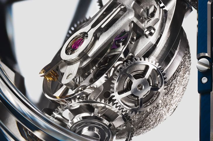 传统陀飞轮是透过持续旋转来平均重力影响,而Zero G模组则更进一步,直接消除了重力对走时的干扰,摆轮与擒纵系统被安装在一个带配重的双轴万向节上,无论手腕如何移动,机芯都能始终保持水平,确保时间精准稳定。动力经由锥齿轮与微型差动器传递,即使模组倾斜,仍能维持能量输送的平衡,这个结构包含139枚零件,并透过9颗陶瓷滚珠轴承运行,体现极高的微型化工艺与工程精度。