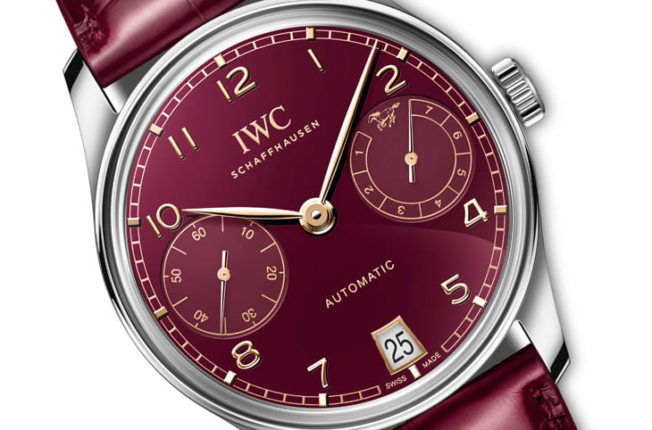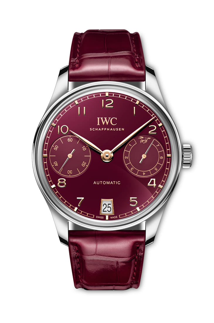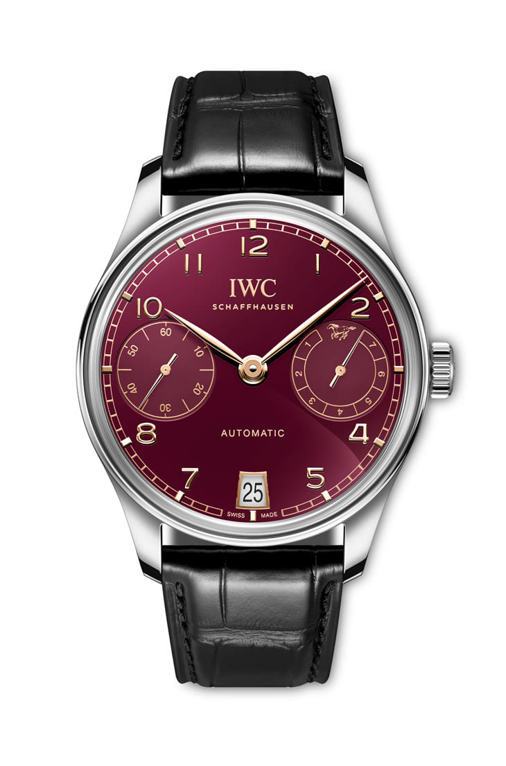 手表採用直径42.4mm不锈钢表壳,侧面轮廓更显纤长,搭配前后Box式蓝宝石水晶,呈现精致而优雅的外观。表壳防水性能达到50米,日常佩戴无虞。面盘採用酒红色调,呼应农历新年的喜庆色彩,同时展现葡萄牙系列标志性的对称美学,金色指针搭配阿拉伯数字时标,提供清晰阅读的同时,增添俐落明快气息,面盘布局维持经典设计:9点钟位置设有小秒针,3点钟位置为动力储存显示,6点钟则是低调的日期视窗,兼具实用与美感。