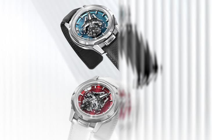 ▲雅典表推出霓光蓝与浓絳红珐琅款,色彩鲜明对比,象徵Freak将传统火焰工艺带入未来。