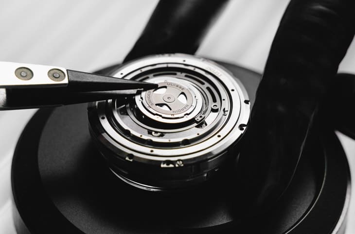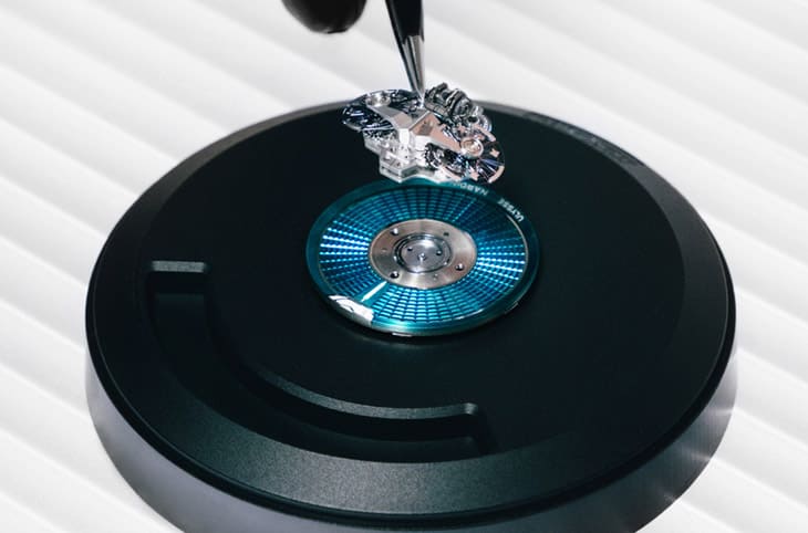 ▲机芯配备两个20°倾角排列的硅质摆轮,透过微型差速器平衡速率,结合DIAMonSIL技术强化稳定性。