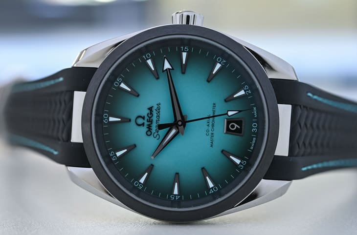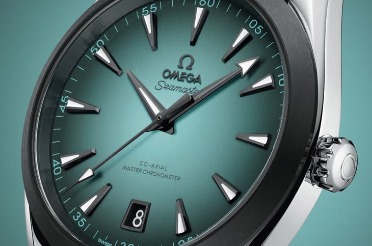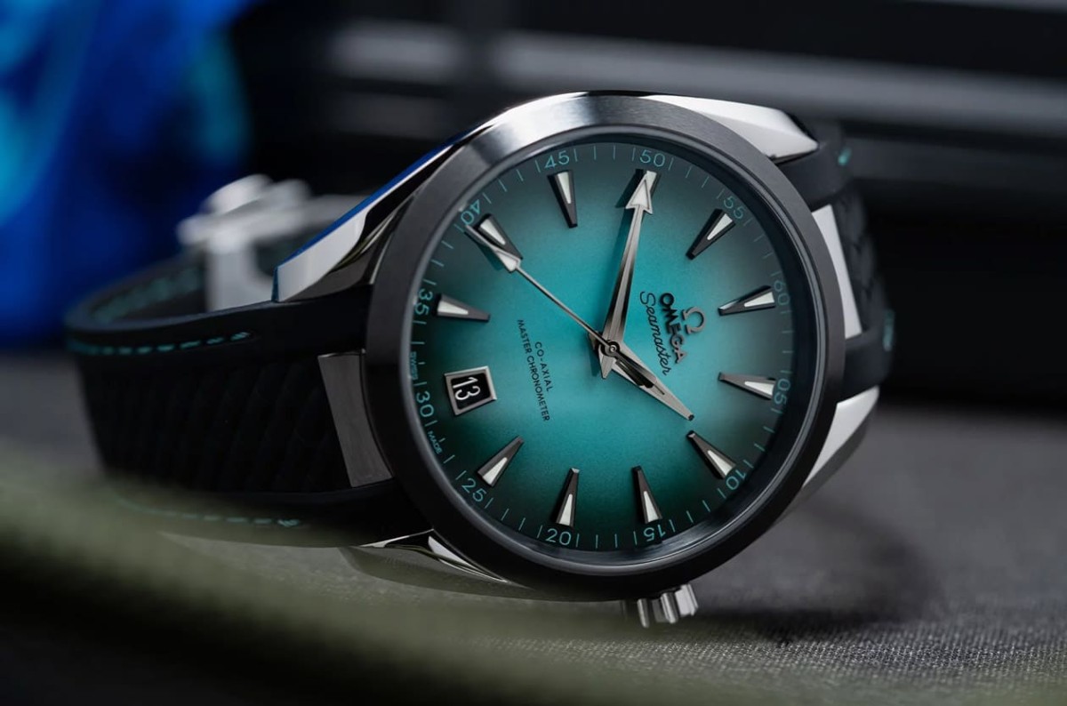 这只Aqua Terra最吸睛的地方,绝对是那片令人着迷的绿松石色渐变面盘,欧米茄这次放弃了传统的「甲板纹」设计,改以平滑亮漆处理,并在色彩上玩出新层次,面盘中央是清新明亮的湖水绿松石色,向外逐渐转深,最终过渡为接近黑色的边缘,形成如同阳光穿透海面时的自然晕染。这种渐变效果不仅让面盘充满立体感,更营造出一种「会呼吸的色彩变化」,在不同光线下,它有时呈现清爽的蓝绿,有时又转为深邃蓝灰,彷彿一池被光影唤醒的海水。深灰色PVD时标与指针则在视觉上提供了强烈对比,细节处理包括拉丝、钻石切割、夜光填料,既有层次也不失可读性。而六点钟方向的日期窗採用深色背景与金属框架,使整体画面更平衡,面盘的设计并非只为了讨好年轻市场,而是欧米茄对「色彩质感」的一次高阶演绎,让经典款式在保留优雅比例的同时,焕发现代生命力。