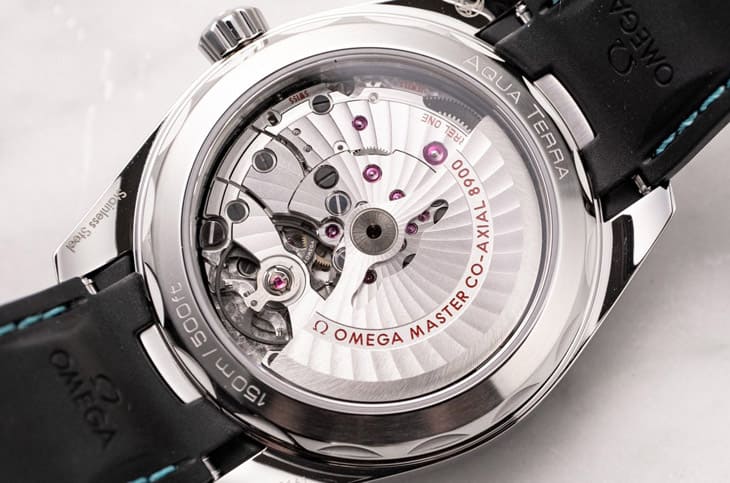 41mm款式搭载的8900机芯具备双发条盒结构,动力储存达60小时,比38mm版本的8800机芯更充足,最关键的是,它通过了瑞士联邦计量研究院(METAS)的大师天文台认证,意味着整只表的精准度、抗磁性能、抗震与稳定性都达到极高水准,抗磁能力高达15,000高斯,这在日常电子干扰环境中几乎是「免疫」级表现。8900机芯还有一项便利设计,它的时针可独立以一小时为单位快调或倒调,而不影响分秒针,对于经常跨时区出差的佩戴者而言,这个设计比传统GMT更直觉实用,透过透明底盖可见机芯的镀銠夹板与日内瓦波纹装饰,摆轮与螺丝也经黑化处理,展现欧米茄一贯的工艺讲究个性。8900机芯的稳定结构与实用功能让这只手表在顏值之外,更具专业时计的深度内涵,这正是Aqua Terra能在同级竞品中长年维持优势的关键。