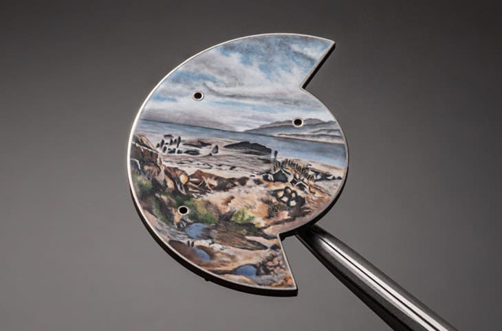 这款手表最迷人的看点莫过于面盘布局:右侧是下层面盘,左侧是上层主题场景,而两者透过高度与材质的差异,形成近乎立体的视觉剧场。下层面盘取材自17世纪希腊地图,以白金为基底,先以线雕工艺刻出海面流动感,再覆上四层透明与灰色珐琅,海岸线因色彩深浅而清楚浮现,细节像是从古书中抽出的地理图。这一步骤乍听简单,但每层珐琅都要经过800°C以上的烧制,任何气泡、溢色都可能前功尽弃。
