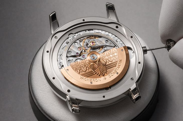 透过透明底盖可欣赏到1120 AT的工艺细节,包括日内瓦波纹、鱼鳞纹与人手倒角构成一幅机械风景,22K金自动盘更是一大亮点,其上雕刻的织锦图案是以1904年古董织锦雕花机完成,呈现细腻的纹理起伏,难得一见。此外,机芯零件作工与运作稳定性获得日内瓦印记认证,是对品质、精度与工艺等级的官方背书。