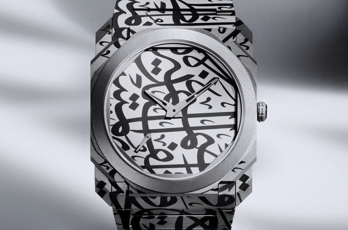 Octo Finissimo系列自出道以来,以乾净俐落的几何线条、义式建筑视觉设计与极致薄型结构成为当代时计美学的代表。宝格丽过去以这个系列屡创超薄纪录,从三问、陀飞轮到Ultra系列,都在挑战传统制表极限。但Octo Finissimo的魅力并未止于技术,它也早已成为品牌跨界艺术合作的理想平台。这次,宝格丽邀请阿联酋当代艺术家 Mattar Bin Lahej,为这款招牌杰作注入浓厚的阿拉伯书法能量。