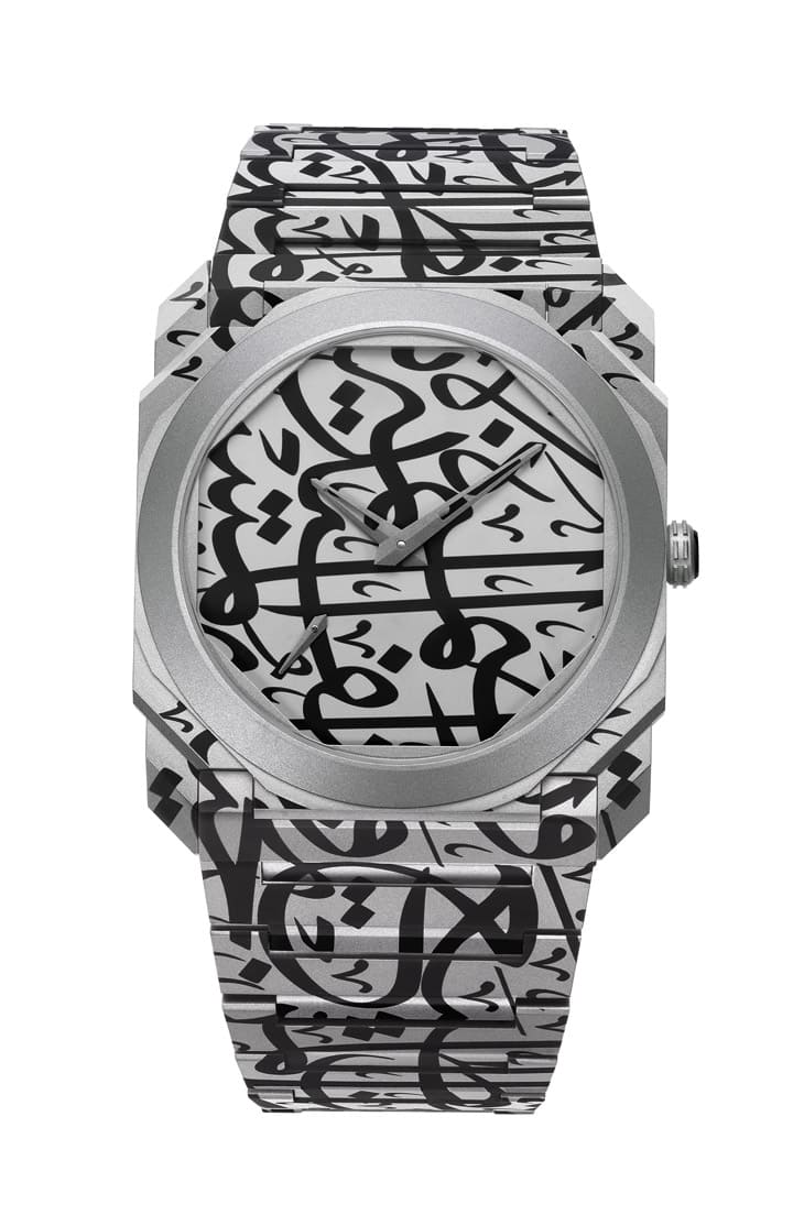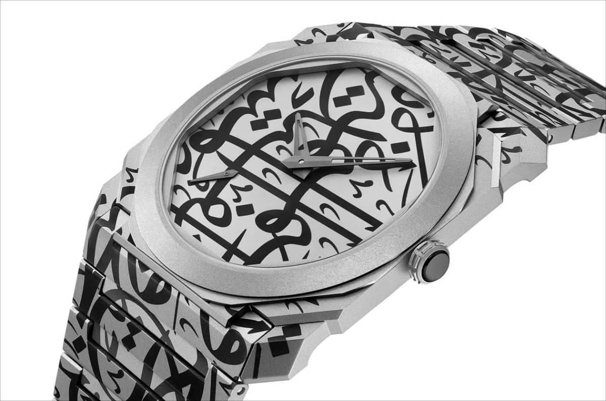 Mattar Bin Lahej是杜拜艺术圈的重要人物,从画廊、雕塑到建筑装置,他的作品皆以强烈动态线条与充满节奏感的笔触着称,他将阿拉伯书法的流动感带入Octo Finissimo的40mm喷砂钛金属壳与链带上,并以精密雷射雕刻技术将文字化为密布的肌理,让整只手表呈现出近似于都市涂鸦般的节奏,但依然保留书法本身的优雅、精神性与文化符号。