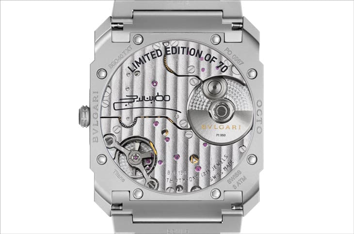 宝格丽钟表产品设计总监Fabrizio Buonamassa Stigliani曾提到,由于引用殿下言论,整个创作流程需要特别授权,也显示出宝格丽对文化合作的尊重与细腻态度。除了艺术性,手表核心仍是Octo Finissimo的超薄机械灵魂,表壳厚度仅5mm,搭载品牌自制BVL138自动机芯,其厚度仅2.23mm,是宝格丽多年深耕薄型技术的结晶,机芯拥有铂金微型自动盘,提供60小时动力储存,震频为3Hz,并能透过透明底盖一览其细腻的日内瓦波纹、倒角与鱼鳞纹装饰,底盖上还刻有艺术家签名,为整个合作计画点缀最直接的印记。
