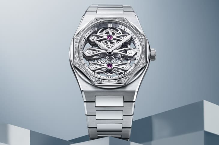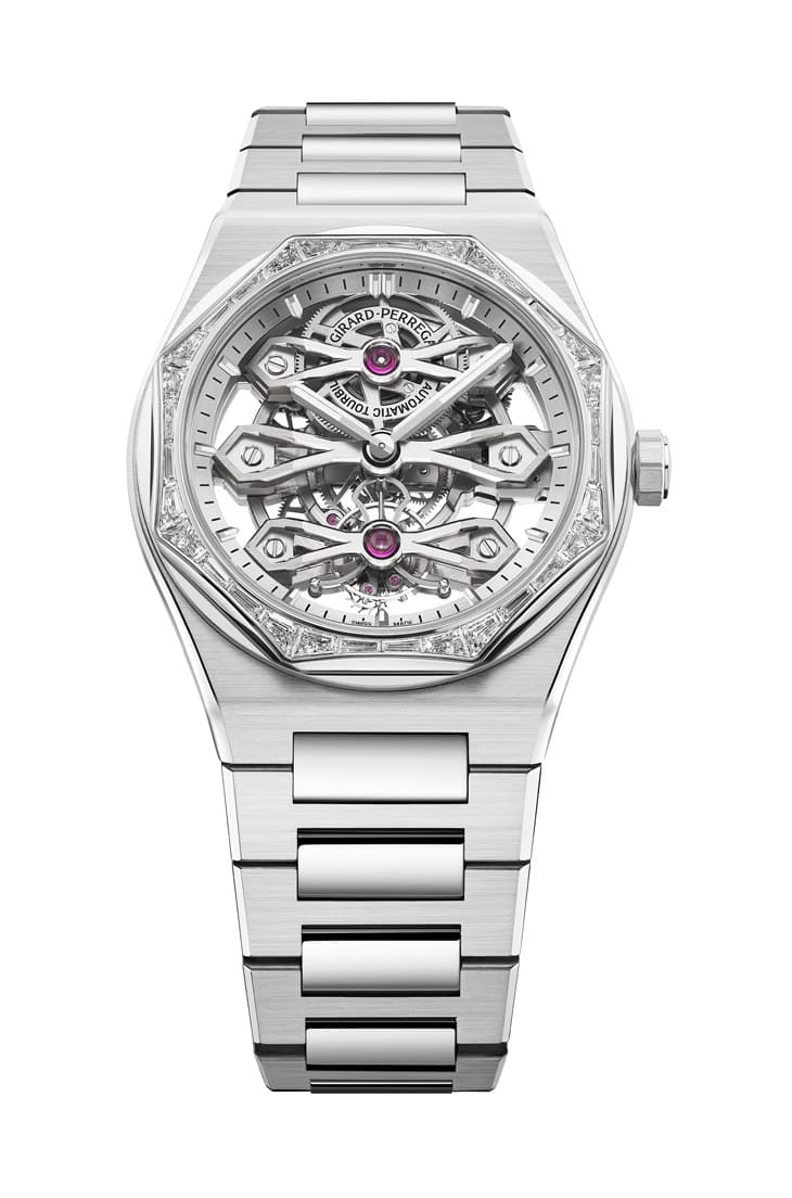 不锈钢、白金材质/GP9620自动上链机芯/时、分、小秒显示/陀飞轮装置/表圈镶长阶梯形切割钻石32颗,约重3.2克拉/蓝宝石水晶镜面、透明底盖/防水30米/表径41mm/参考价:NT$ 7,386,000