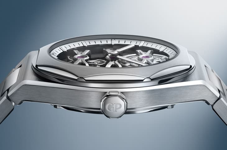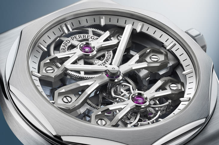 ▲GP9620机芯以隐藏微型自动盘保持通透视觉,精致倒角与竖琴陀飞轮展现品牌扎实工艺水准。