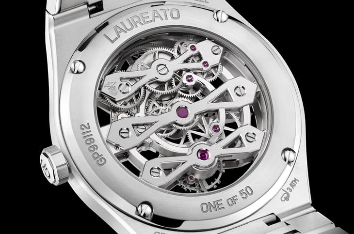 不锈钢、白金材质/GP9620自动上链机芯/时、分、小秒显示/陀飞轮装置/蓝宝石水晶镜面、透明底盖/防水30米/表径41mm/限量50只/参考价:NT$ 5,465,000