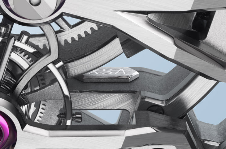 三座桥板水平排列,形成极高的轴线一致性,上方负责固定发条盒并整合自动上链;中央桥板支撑走时轮系;下方则稳固框住一分钟陀飞轮,将三大组件沿中轴线垂直排列,本身就是制表工艺难度的体现,但视觉均衡度又高得惊人。三金桥之所以成为制表史上的经典,正是因为它兼顾美学、结构与功能,甚至足以把「技术」变成「设计」。