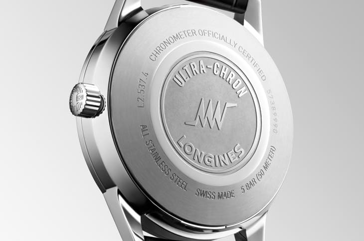 ▲搭载L836.6机芯并通过TIMELAB认证,实心底盖雕刻经典标志,强调专业性能定位。