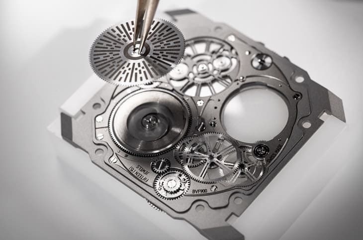 但有了空间还不够,工程师必须重新安排所有齿轮、摆轮、陀飞轮笼架的位置,从垂直思维转向水平思维,把每一枚零件像建筑平面图一样摊平,手表搭载的BVF 900机芯因此成形,一枚每秒震动8次、具有42小时动力储存的超薄心臟,其结构完全为陀飞轮重新设计。