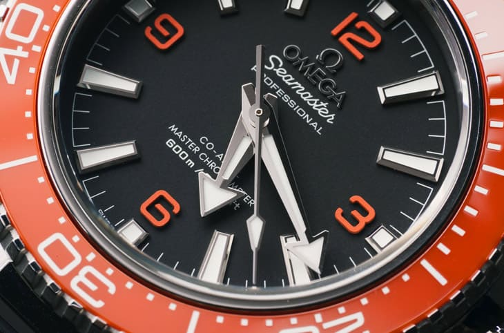 讲到Planet Ocean,首先想到的一定是橘色,第4代把这个经典形象做得比以往更讲究:橘色表圈不再是铝、不再是混合材质,而是直接以「全陶瓷」打造,橘色陶瓷要烧得鲜明又稳定本来就不容易,欧米茄这次把表现推到极限,光泽、饱和度和均匀度都显示出成熟的陶瓷配方,刻度部分也没有沿用其他顏色款的珐琅,而是改用白色混合陶瓷,视觉对比更清楚、耐磨程度也更高。面盘採雾面黑设计,搭配涂橘色清漆的阿拉伯数字时标,这些数字不只换了更方正的字体,还做成开口式造型,向初代致敬,但视觉更现代化。外观线条是这代最明显的变革,同样是42mm尺寸,但整只表像重新雕过身材,厚度大幅降至13.79mm,视觉比例明显更俐落,表壳的切面、倒角都变得更锐利、有层次,从某些角度看甚至有点像高级运动表的精致收边。新款的链带也经过全面重设,例如三板式外形更平整细腻,拉丝与拋光层次分明,从21mm收窄到表扣的16.5mm,佩戴起来更贴手,视觉也更修长,这种整体性提升,让第4代PO不只是复古调味的怀旧品,而是一件带有雕塑感的现代潜水表。