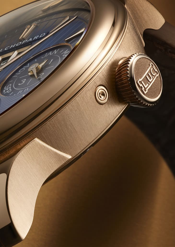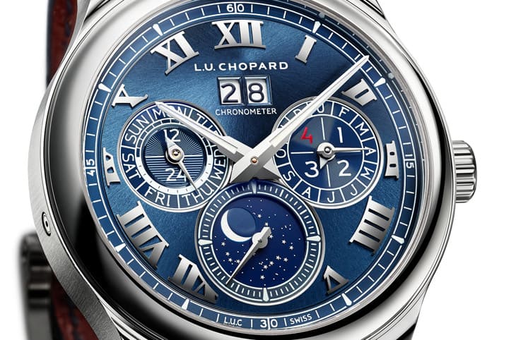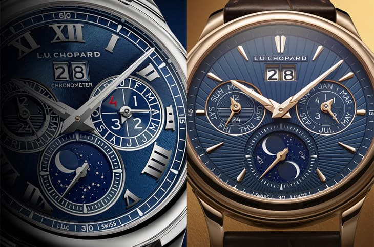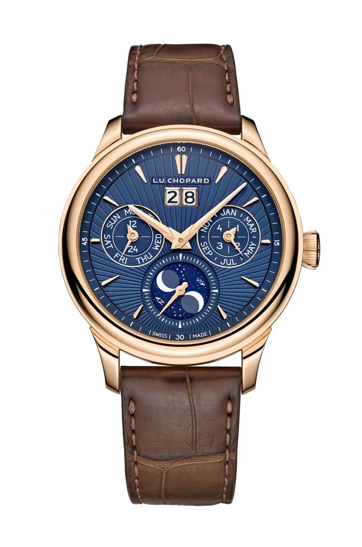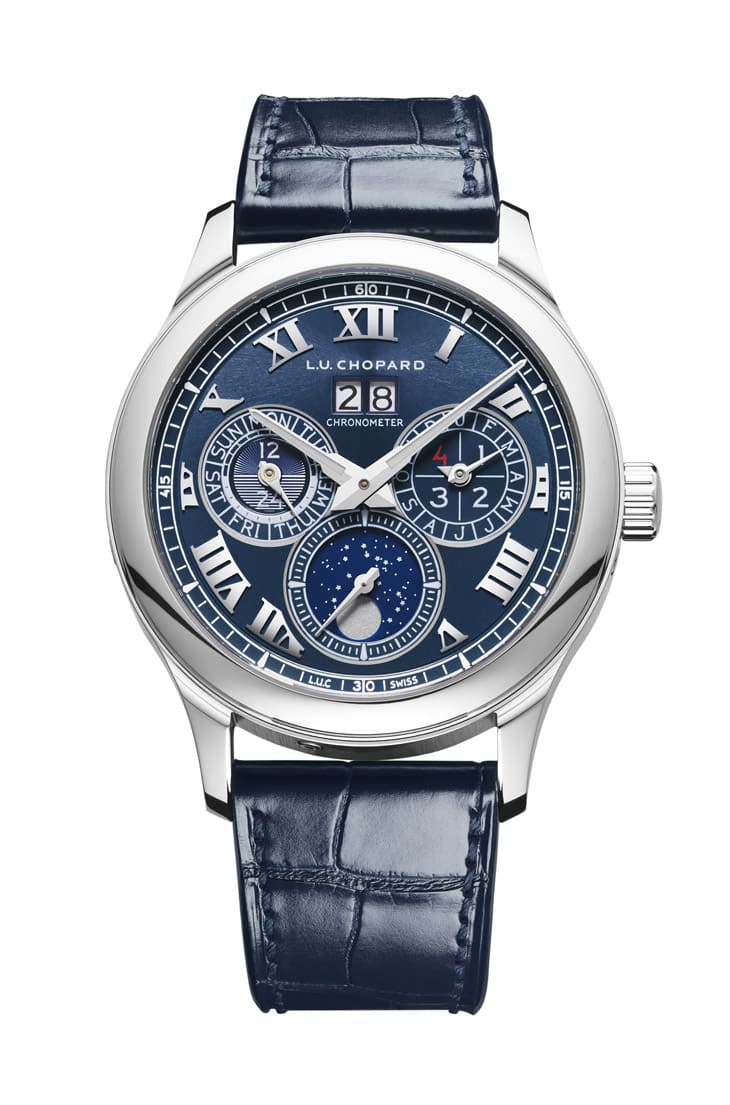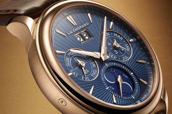 面盘延续 L.U.C系列经典设计,採手工扭索雕纹工艺,6点月相为中心呈放射状蓝色太阳纹,层次丰富,12点大日期双视窗瞬跳清晰,搭配尖剑型指针与立体时标,读时直觉易懂,万年历资讯布局均衡,包括日期、星期、月份、闰年及24小时刻度,兼具功能性与美感。