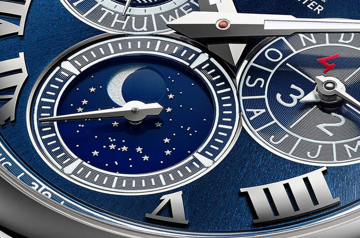 ▲12点钟方向有瞬跳大日期视窗,万年历资讯清晰匀称,6点钟位置则配置独特的轨道式月相,视觉平衡且优雅。