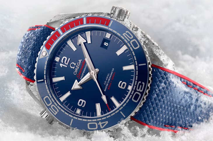 ▲2018年平昌冬奥海马Planet Ocean 600M具600米防水,深蓝陶瓷面盘揉合红色橡胶细节,巧妙呼应韩国国旗的经典色彩。