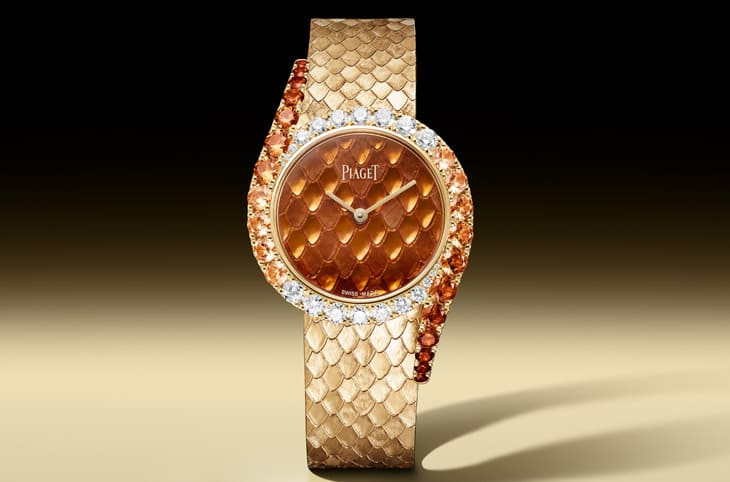 第一款「18K玫瑰金锰铝榴石珐琅彩绘珠宝表」走的是强烈视觉路线,面盘与链带採用罕见的「鳞纹」雕刻,灵感来自蛇鳞起伏,工匠透过拋光与细线刻划交错处理,让光线在不同角度下产生层层反射,动感十足,更吸睛的是面盘上的大明火珐琅,半透明橘色珐琅需经800°C以上高温反覆烧制,每一次进窑都是风险考验,最终呈现出的色泽深邃而通透,与底层雕刻纹理形成立体错视效果,彷彿火焰在金质表面流动。