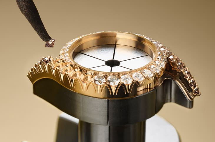 18K玫瑰金材质/501P1自动上链机芯/时、分显示/表圈镶干邑色与白色钻石42颗,约重4.74克拉/蓝宝石水晶镜面/表径32mm/参考价:NT$ 3,720,000