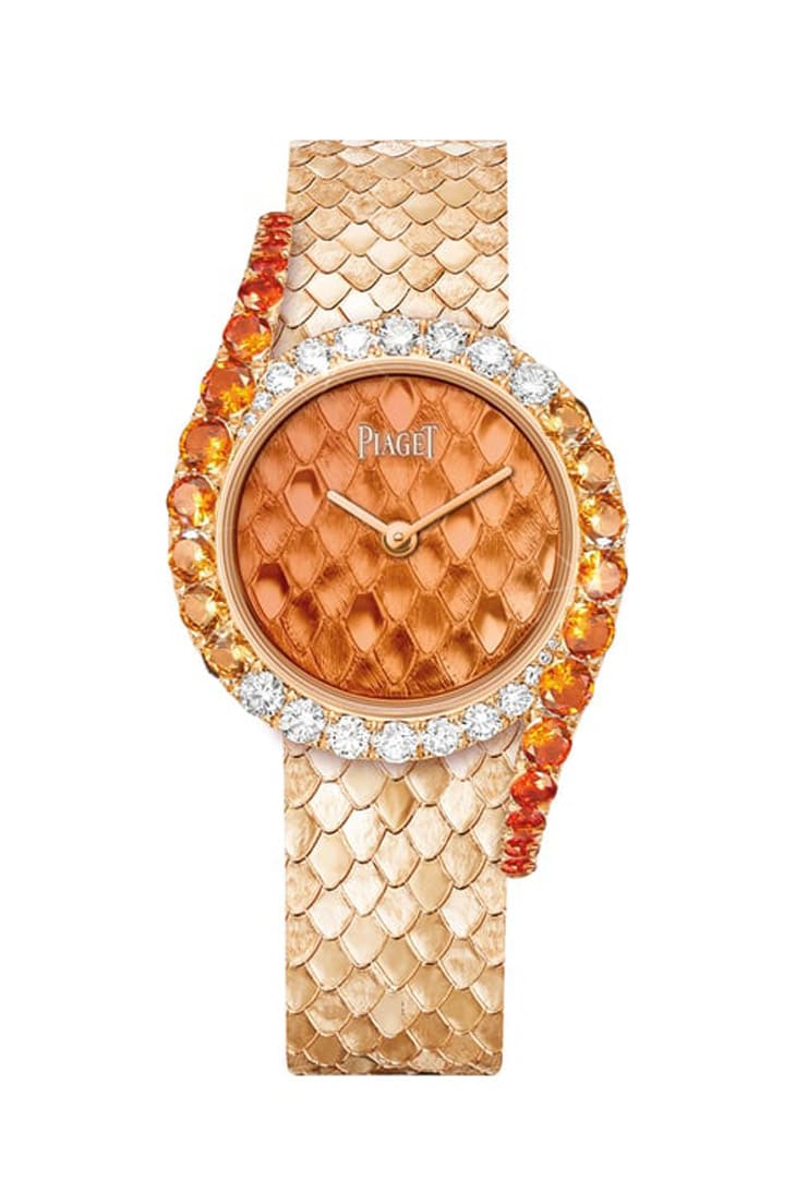 18K玫瑰金材质/501P1自动上链机芯/时、分显示/表圈镶橘色锰铝榴石22颗,约重4.2克拉、钻石20颗,约重1.46克拉/半透明橘色珐琅面盘/蓝宝石水晶镜面/表径32mm/参考价:NT$ 4,760,000