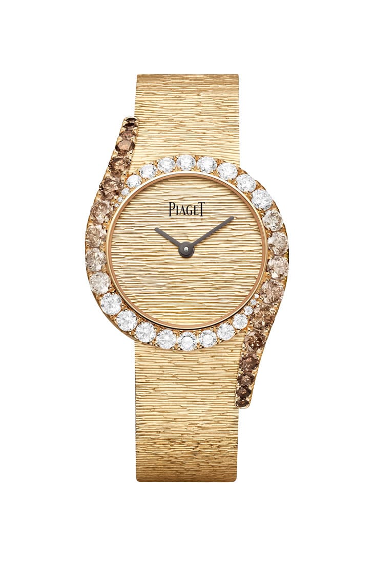 另一款「18K玫瑰金干邑色钻石珠宝表」则展现较为内敛的气质,它同样运用PIAGET拿手的Décor Palace宫廷式雕刻饰纹,但纹理更接近自然原木的树皮质感,横向刻纹不规则延展,让整体光影更温润、柔和。表圈镶嵌42颗总重约4.74克拉的干邑色与白色钻石,色彩由浓转淡,从延伸表耳一路向面盘中心过渡,最终与白钻融合,这种渐层设计不张扬,却极有层次,近看能感受到细腻的色温变化。