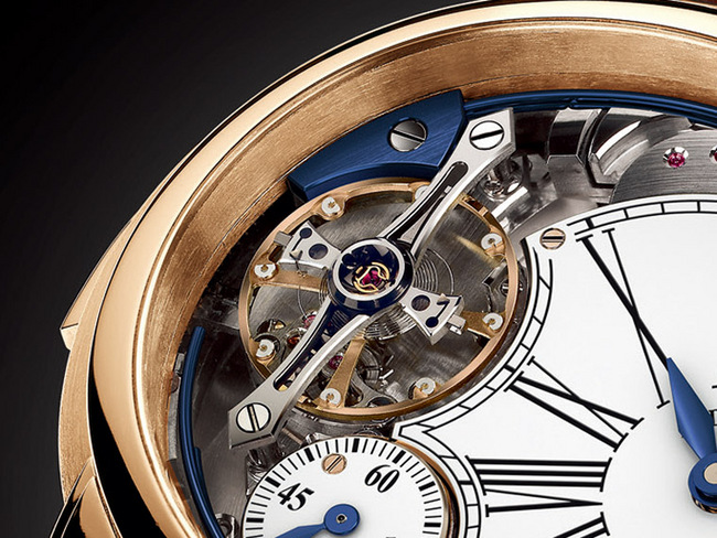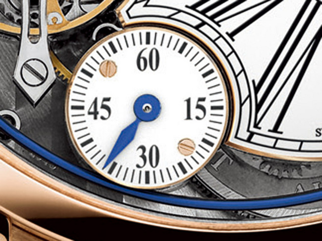 与蓝色音簧作出对应色调的偏心小秒指针,在玫瑰金的表体中更显高贵,伴随着爱彼特制的半鏤空面盘处理,更显精致万分。