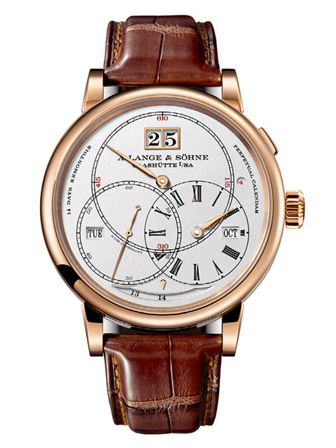 18K玫瑰金材质/L096.1手上鍊机芯/规范式时、分、小秒、大日期显示/万年历功能/轨跡式月相显示/动储显示/蓝宝石水晶镜面/表径45.5mm