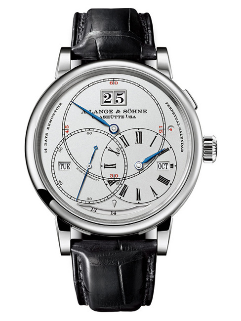 18K白金材质/L096.1手上鍊机芯/规范式时、分、小秒、大日期显示/万年历功能/轨跡式月相显示/动储显示/蓝宝石水晶镜面/表径45.5mm