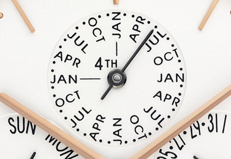 推动万年历模组的关键零件包括48 月齿轮和4 年轮,前者能够显示当月天数为28 日∼31 日的区间差别,而后者就是一枚自转周期达四年的微型轮,有了它,每到闰年的2 月底,腕表才会自动由2 月29 日切换至3 月1 日,因此表厂往往也会特别为4 年轮设置能对应显示于面盘上的视觉线索,让佩戴者更能清楚掌握时间的动向。不过与日、星、月等常用日历显示有别,闰年显示由于周期长且仅被视作一种辅助辨时的资讯,因此其设计并不会特别显眼,与其他日历显示保持一种既不会抢走风采、却又能在佩戴者需要时提供清楚指示功用的微妙平衡关系,而闰年显示在长年演进历程中亦早已衍生出多样化的主流设计类型。