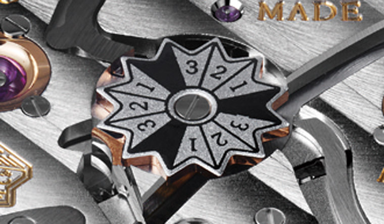有别于多数万年历腕表的闰年显示,亨利慕时反而将其置于表背,同时显示装置也异于常见设计。