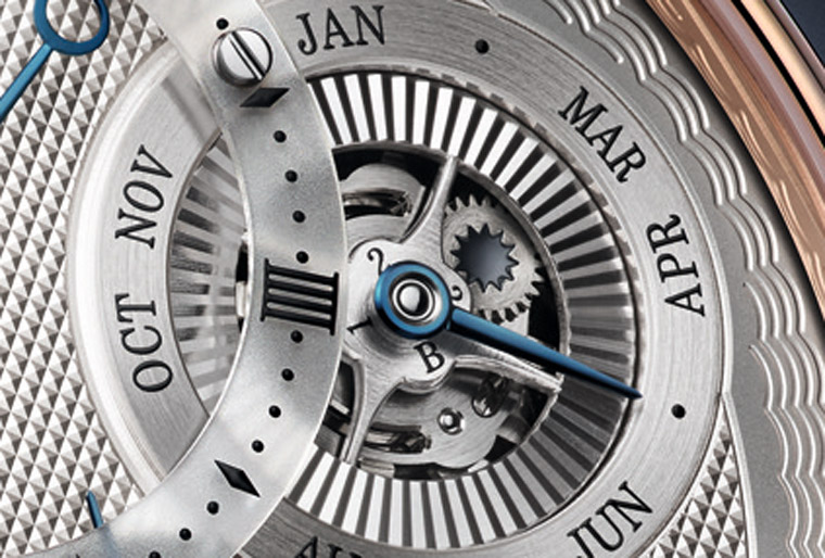 宝璣的3797腕表闰年显示位于面盘3点方向,其四分割刻度的第四年以字母"B"(Bissextile)代表。