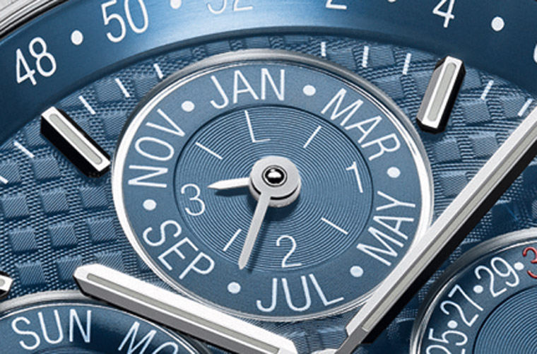 万宝龙这只万年历表的闰年显示于表盘刻印1~4数字刻度,再搭配印有三角指标的转盘指示闰年。