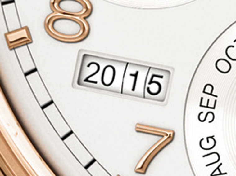各家表厂的视窗设计各有千秋,如朗格万年历腕表的视窗会看到闰年是红字的阿拉伯数字4,至于万年历表叫好叫座的表王PP,也有部分款式以视窗搭配罗马数字转盘交代闰年,此外格拉苏蒂腕表的万年历腕表则把闰年讯息「色块化」,转盘分别用黄、黑和白色代表平年,闰年则是红色。还有一种特殊例子是IWC、积家和VC 都曾推出的四位数年份显示,虽没有特别增设闰年显示,但稍懂门道的佩戴者只要运用能否被4 整除的概念,其实它也是一种提示闰年的设计变体。