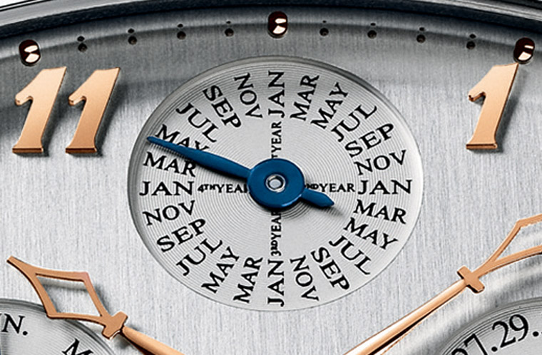 朗格的万年历腕表将闰年显示设在面盘6点方向,透过红色的阿拉伯数字4清楚易懂。