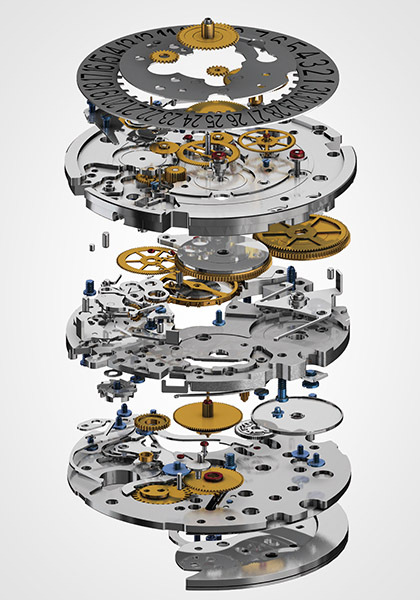 880P是以伯爵新一代的基础机芯800P为底,800P本身的厚度就只有3.95mm,而它在结构上的特色是它的轮系都绕过了中央位置,因此机芯的中央预留了大片的空间,等到要改制成计时机芯的时候正好用来装计时模组,水平分散的空间利用方式让880P只比800P厚了1.65mm;另外有别于新生代的基础机芯基于保修上的便利分件时多採用多枚夹板,880P则是以一枚大夹板盖住所有加装的机构,这也让机芯的厚度减少了许多,强度也比较高。