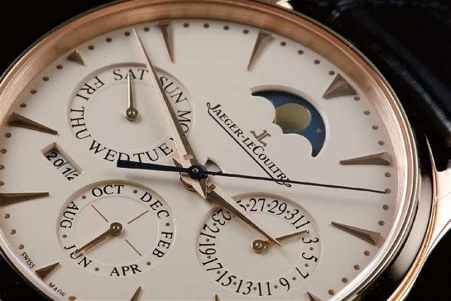 积家的Master 系列万年历腕表採用尖锥状时标样式,并于3、6、9、12 点方向微缩时标以资区辨。