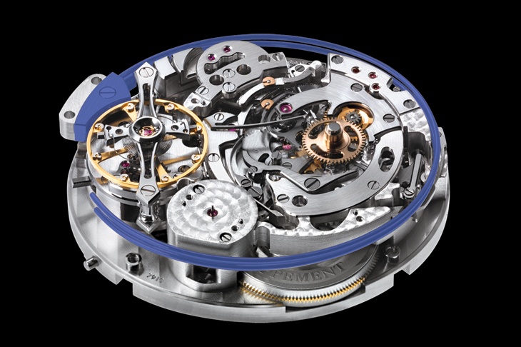 具有直接传动式爱彼独家擒纵系统、可调式砝码摆轮、平面双游丝等,环绕机芯一整圈的蓝色音簧,以优雅曲线优美环绕,机芯所有元件皆经手工装饰:手工倒角、凹角打磨、蜗形螺纹装饰、直纹拋光打磨,机板饰以横向日内瓦波纹及鱼鳞纹装饰。
